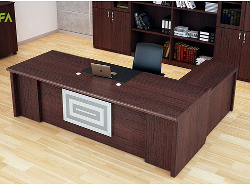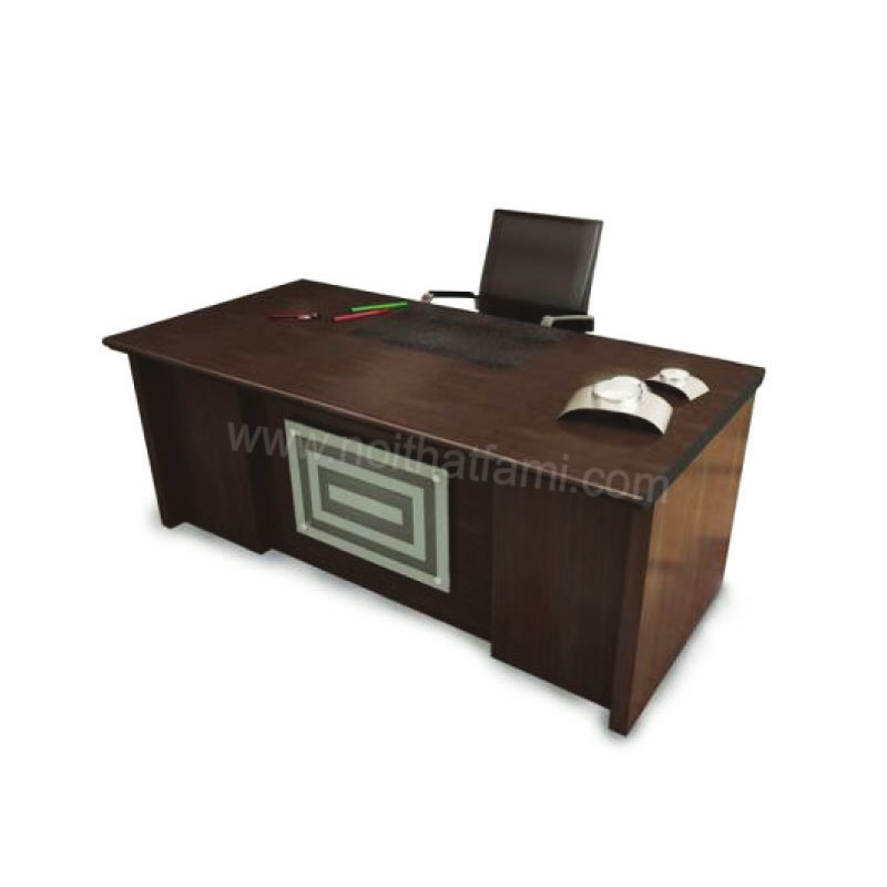 Bàn giám đốc BGD1809F chất liệu gỗ công nghiệp cao cấp phủ Laminate Hàn Quốc. Mặt và hồi dày 48mm có miếng Laminate vân da trang trí trên mặt bàn. Hậu bàn sát đất dày 24mm