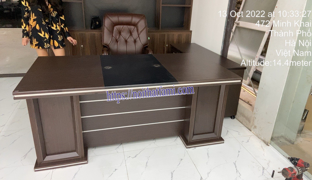 Bàn giám đốc BGD1809F2 chất liệu gỗ công nghiệp cao cấp phủ Laminate Hàn Quốc. Một bên hồi có 3 ngăn kéo, một bên trống để CPU máy tính