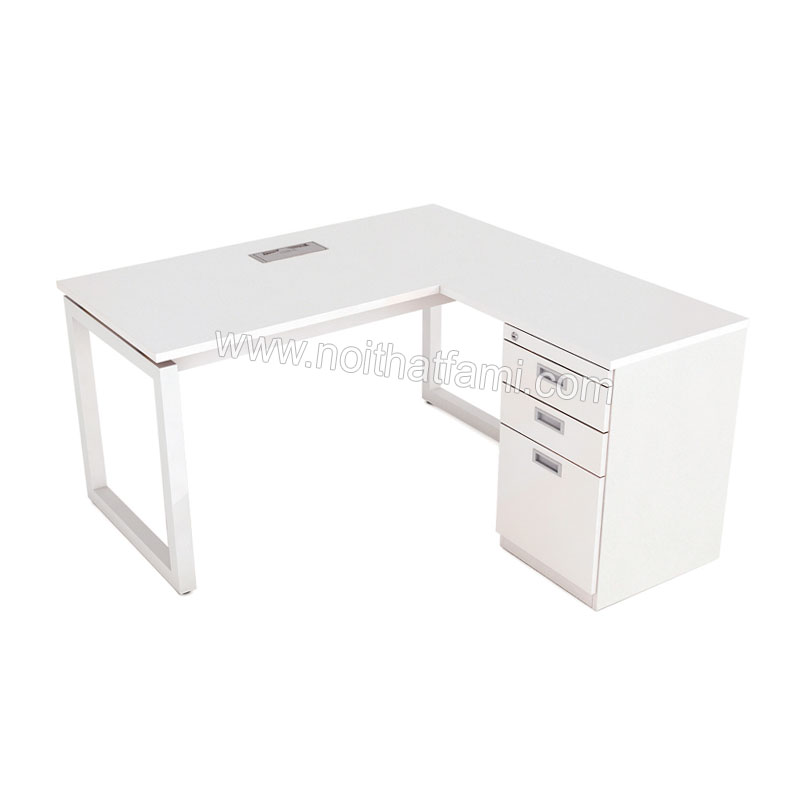 Bàn lượn phải chân sắt RH1414SL1-R có hộc, khung sắt chắc chắn kết hợp gỗ công nghiệp MFC phủ Melamine Hàn Quốc chống trầy xước, chồng thấm nước, dễ lau chùi.