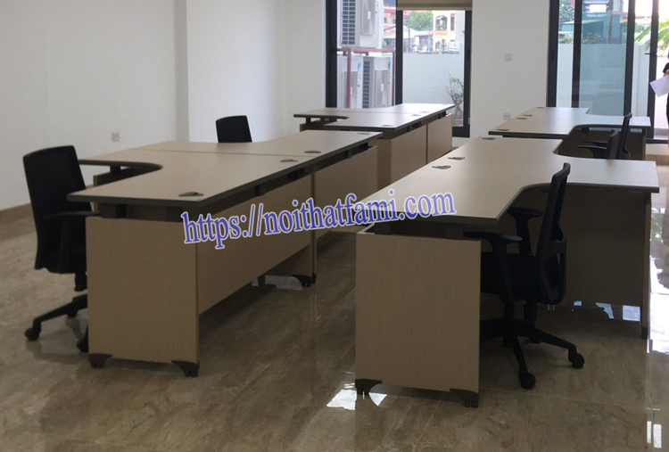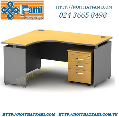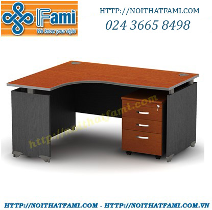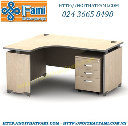 Bàn lượn chữ L Fami CP1400HL lượn trái, bề mặt phủ Laminate (HPL) Hàn Quốc có khả năng chống cháy, chống trầy xước, chống thấm nước. Các cạnh bàn được thiết kế viền bàn bo tròn(Forming)