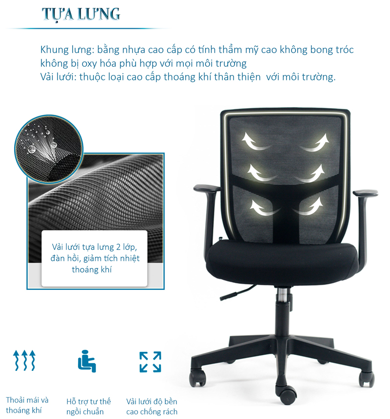 - Tựa lưng bằng vải lưới liên kết chắc chắn với khung ghế