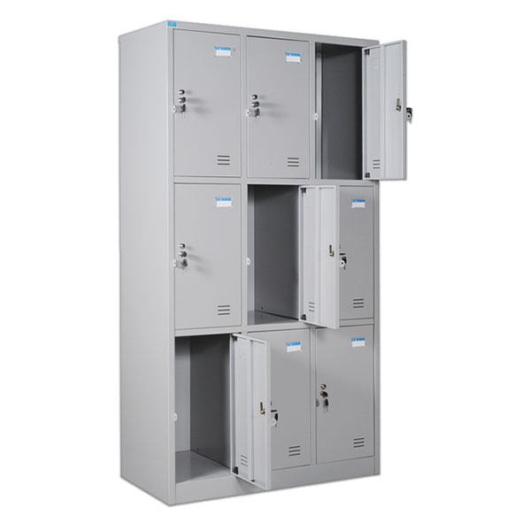 Tủ cao 3 buồng, mỗi buồng chia 3 khoang, cánh mở, có lỗ thông hơi.