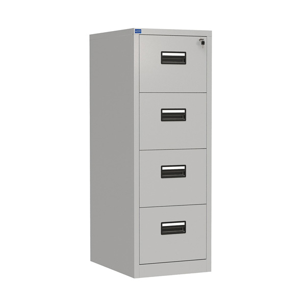 Tủ file 4 ngăn. Mỗi ngăn có 1 tay nắm ở giữa mặt ngăn kéo, chung 1 khoá file.